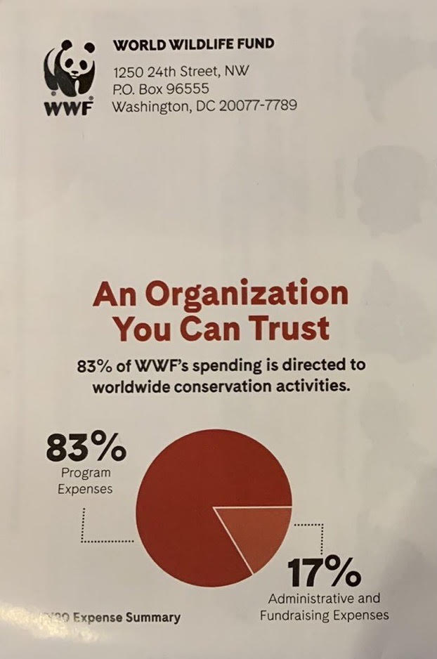 World Wildlife Fund, meanwhile, recently sent out a mailer with this graphic, proudly touting that with 83% of their funds going to conservation efforts and only 17% going to administrative and fundraising expenses, they are an “organization you can trust.”